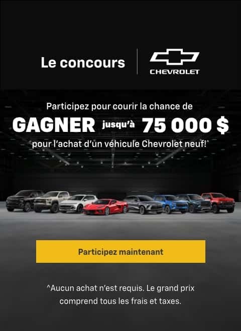 * Les rabais instantanés des fabricants de pneus vous sont offerts à l’achat de quatre (4) pneus admissibles identiques chez les concessionnaires Chevrolet, Buick, GMC et Cadillac participants au Canada. Rabais instantanés en vigueur : 120 $ sur les pneus d’hiver Bridgestone, 90 $ sur les pneus d’hiver Firestone, 80 $ sur les pneus d’hiver Continental (y compris les SecureContact AW), 70 $ sur les pneus Michelin, 70 $ sur les pneus Pirelli, 60 $ sur les pneus d’hiver Hankook, 50 $ sur les pneus BFGoodrich et 40 $ sur les pneus d’hiver General (y compris les AltiMAX 365 AW). Offre en vigueur du 1er septembre 2025 au 31 décembre 2025. Cette offre est non transférable et ne peut pas être combinée à certaines autres offres. Pose et équilibrage non inclus. Limite d’un (1) rabais instantané de fabricant de pneus par NIV. Certaines conditions et restrictions s’appliquent. L’offre pourrait ne pas s’appliquer aux pneus de tous les modèles GM; détails chez concessionnaires participants. Aucun bon de réduction différée. Cette offre peut être modifiée, annulée ou prolongée à tout moment et sans préavis.nn1 GARANTIE DU MEILLEUR PRIX DE 30 JOURS SUR LES PNEUS : Le détaillant égalera le prix de la concurrence. Si vous achetez une des marques de pneus de remplacement énumérées ci-après et trouvez ensuite ces pneus d’une marque admissible à un prix concurrentiel dans les 30 jours suivant votre achat, nous vous rembourserons l’écart de prix. Marques de pneus admissibles : BFGOODRICH, BRIDGESTONEMD, CONTINENTAL, FIRESTONEMD, GENERAL, GOODYEARMD, HANKOOK, KELLY, MICHELIN, PIRELLI, UNIROYAL, KUMHO. La Garantie du meilleur prix s’applique aux marques énumérées ci-dessus. Prix de la concurrence : Le prix de la concurrence soumis doit figurer dans une publicité, ou encore une estimation écrite ou en ligne valable et portant sur des pneus identiques neufs. Les pneus doivent être exactement de la même marque, gamme, taille, capacité de charge et cote de vitesse pour être admissibles à la Garantie du meilleur prix. Toute estimation de la concurrence (y compris les estimations en ligne) doit provenir d’un détaillant-installateur de pneus de la région (ayant des locaux dans un rayon de 100 km autour de votre détaillant GM participant). Le prix de la concurrence doit être en vigueur dans les 30 jours suivant l’achat de vos pneus d’une des marques énumérées plus haut. Service et installation : La Garantie du meilleur prix s’applique exclusivement au prix des pneus et ne comprend pas l’installation et la main-d’œuvre. L’offre s’adresse uniquement aux particuliers et est valable uniquement chez les concessionnaires Chevrolet, Buick, GMC et Cadillac participants du Canada. Offre en vigueur du 1er janvier au 31 décembre 2025. GM Canada se réserve le droit d’annuler, de modifier ou de rectifier l’offre sans préavis. Certaines conditions et restrictions s’appliquent. Ne peut être combinée à d’autres offres et programmes.